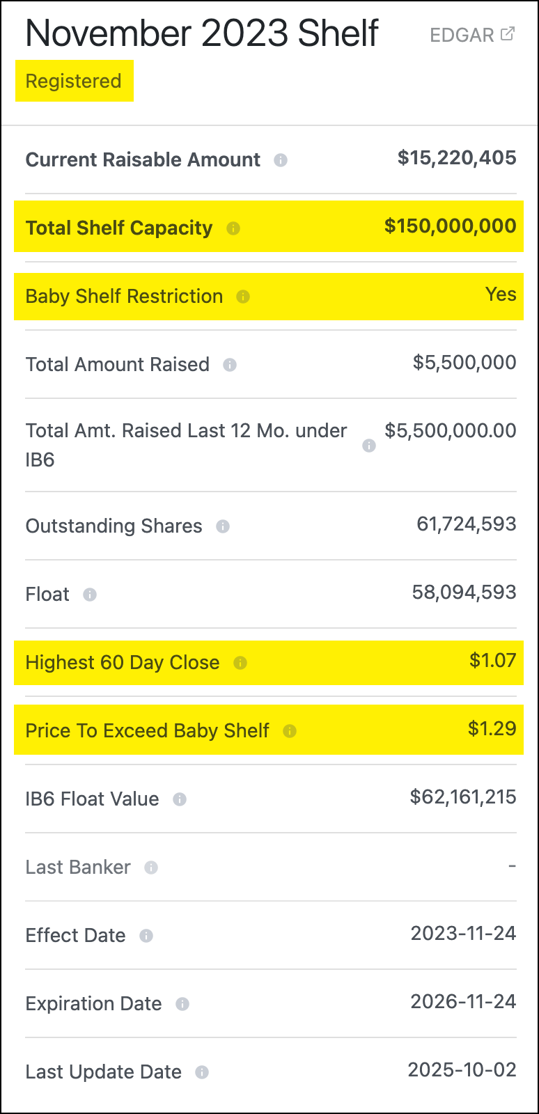 With the stock price up from $.30’s to $2’s in a few weeks and the baby shelf of $150M unlocked (assuming a $1.29+ close) then risk goes up for longs.