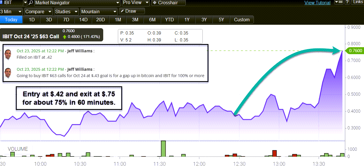 In just about 60 minutes, the IBIT calls I alerted went from $0.42 to $0.75 — roughly 75% in an hour: