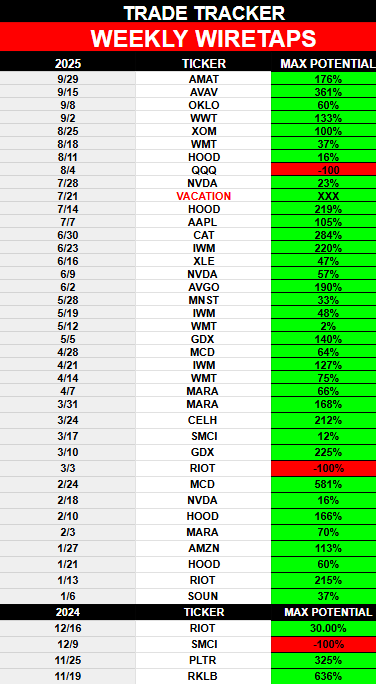 This week's AMAT move (176% potential in 3 days) represents the possible 36th winning trade out of 38 Weekly Wiretaps alerts I've sent in 2025.